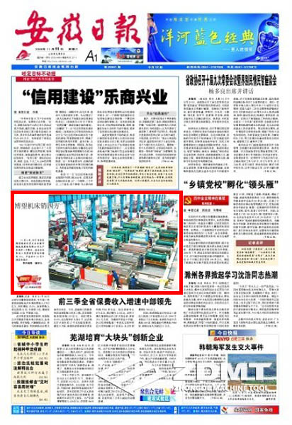 本日(ri)(ri)(2009年11月11日(ri)(ri🦂))《安徽日(ri)(ri)报》头版刊(kan)载《博(bo)望机(ji)床(chuang)销(xiao)四(si)方》的(de)(de)图片消(xiao)息报道。在(zai)我公(gong)司大型(xing)车(che)间图片中,配出以下笔墨报道:15月6日(ri)(ri),在(zai)当涂(tu)县博(bo)望镇的(de)(de)民企中小型(xing)机(ji)构江苏中德数控(kong)机(ji)床(chuang)股分(fen)无线单位盛产(chan)车(che)间管理里一个(ge)辛勤工作。该中小型(xing)机(ji)构本年度前三第二(er)季度发卖量相比(bi)多35%,货(huo)物进口30很多个(ge)之地和地区(qu)性。(特约服务拍个(ge)照 谢富乐)