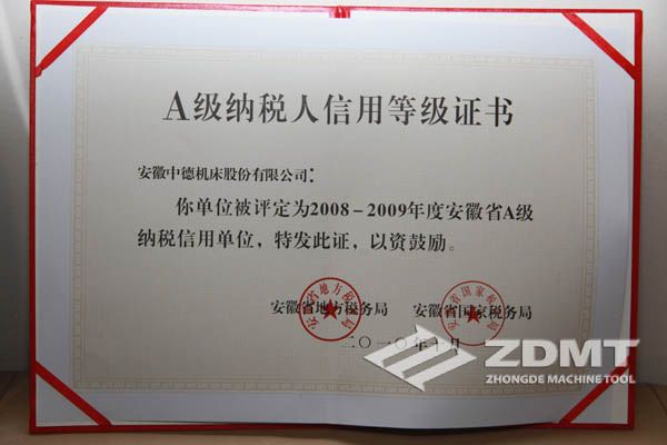 中德机床荣获“2008-2009年度安徽省A级征税诺言单元”声誉称呼